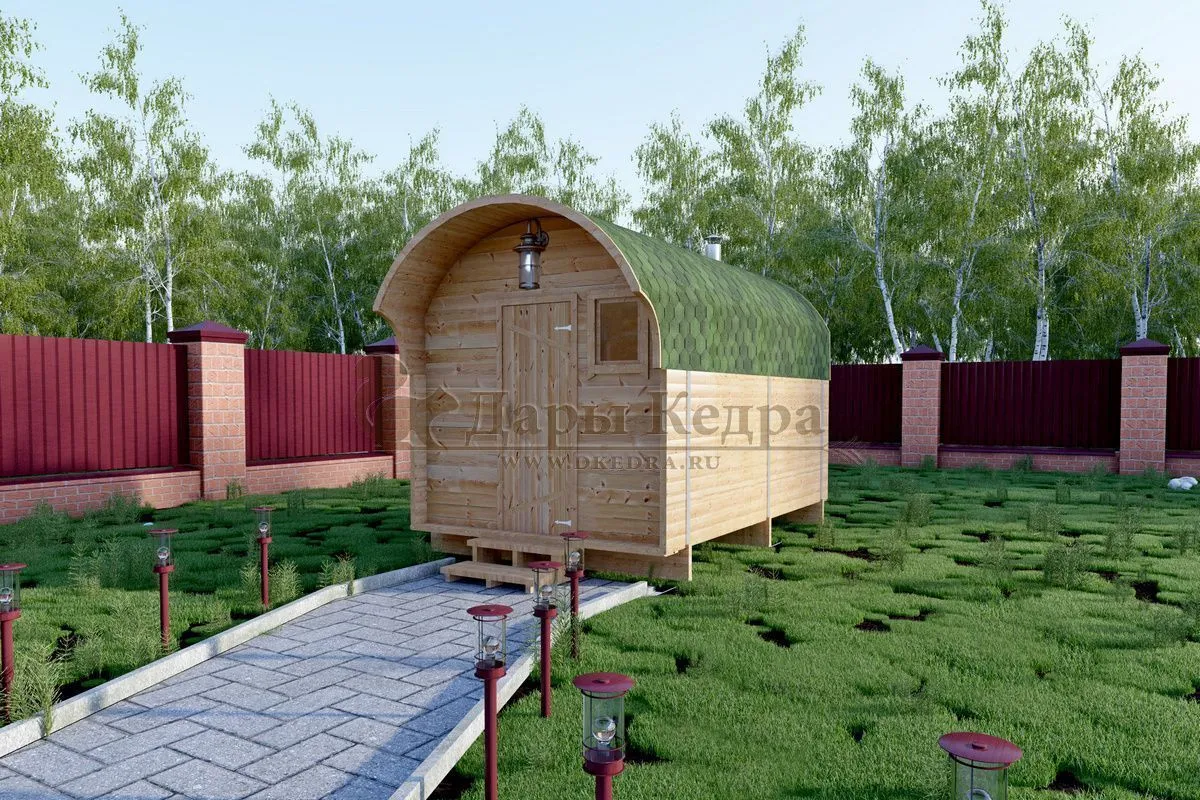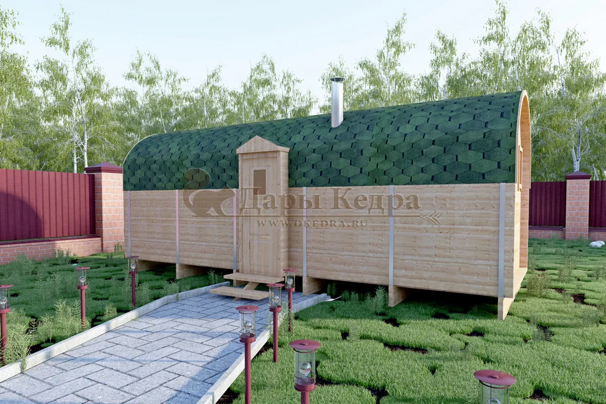 • Баня-бочка буханка из кедра с козырьком (все размеры) Баня-буханка более просторная за счет увеличенной высоты потолков и ровного пола. Козырек не только украшает баню, но и защищает оставленную обувь от дождя. Лавочки из кедра находятся по всей длине бани-бочки с обеих сторон. Печь расположена в парилке около дальней стены. Время растопки такой бани не превышает 30 минут. В зависимости от выбранного размера баня-бочка буханка с козырьком имеет следующую комплектацию: Баня-бочка буханка 2,5 метра - парилка; Баня-бочка буханка 3,5 и 4,5 метра - раздевалка, парилка; Баня-бочка буханка 5,5 метров - раздевалка, парилка, моечная. По вашему желанию ее можно укомплектовать печью с внешней загрузкой, благодаря которой весь мусор вовремя топки остается на улице. Баня-бочка буханка не требует полноценный фундамент, поэтому при необходимости ее можно перенести в другое место. Обращаем Ваше внимание, что в стандартную комплектацию бани входят полки открытого типа в парной с обеих сторон. Дополнительно можно заказать полок закрытого типа или лавку! Кедр обладает ароматическими свойствами. Он не деформируется и влагоустойчив, при правильном уходе за деревом на нем не развиваются грибки и плесень.