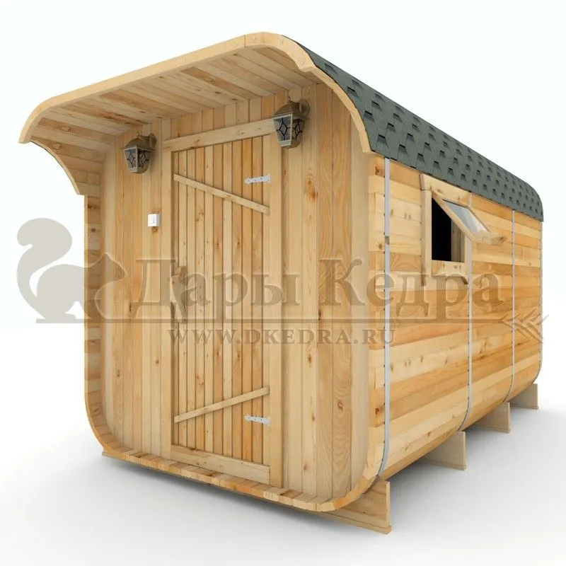 Это прямоугольное изделие с закругленными углами. За счет такой конструкции во время топки воздух циркулирует по кругу, поэтому баня-бочка нагревается не более 30 минут. Козырек не только украшает баню, но и защищает оставленную обувь от дождя. Лавочки из кедра находятся по всей длине бани-бочки с обеих сторон. Печь расположена в парилке около дальней стены. В зависимости от выбранного размера баня-бочка квадро с козырьком имеет следующую комплектацию: