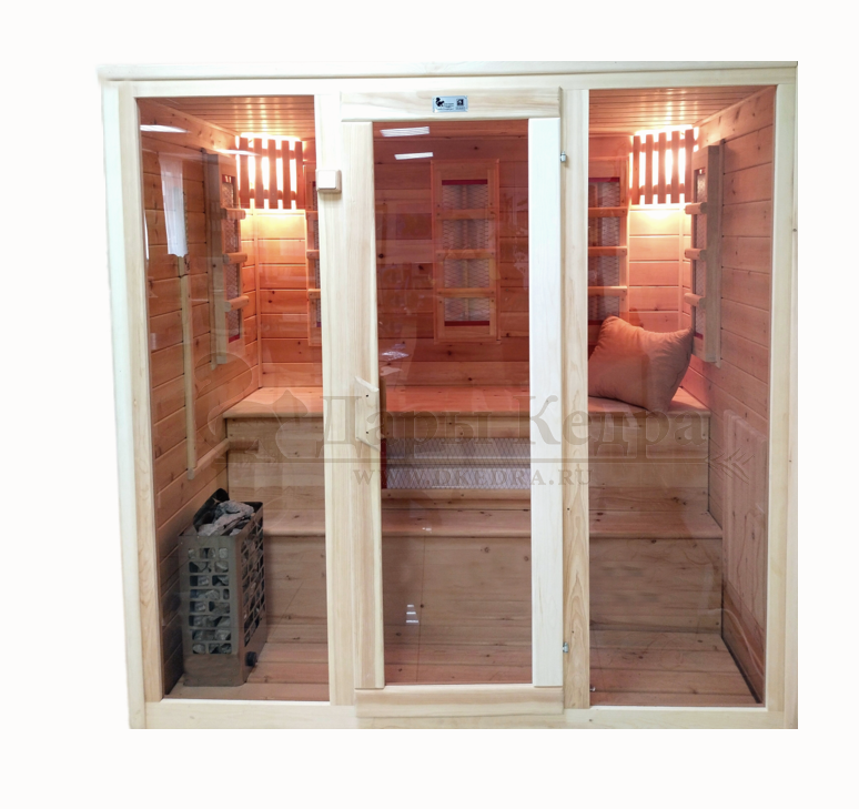 Данную модель можно использовать как инфракрасную кабину, так и финскую сауну. Керамические нагреватели отвечают за сухое тепло. Они излучают инфракрасные лучи, которые равномерно прогревают тело человека. Электрическая печь нагревает кабину изнутри и позволяет сбрызгивать камни водой, слегка увлажняя воздух.