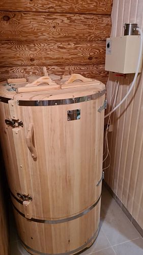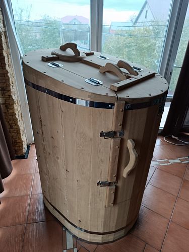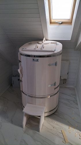 Дома стоит такая фитобочка уже полтора года, пользуемся каждый день! Очень нравится, бочку покрыли в бесцветный лак, т.к. спальня у меня полностью в таком цвете под дерево. Смотрится очень интересно и необычно! Парогенератор к бочке брали самый дорогой, поэтому не жалуюсь, всё работает, как по часам: можно поставить отсрочку на таймере или наоборот задать время процедуры. Рекомендую работать с компанией Дары Кедра и своим знакомым:)